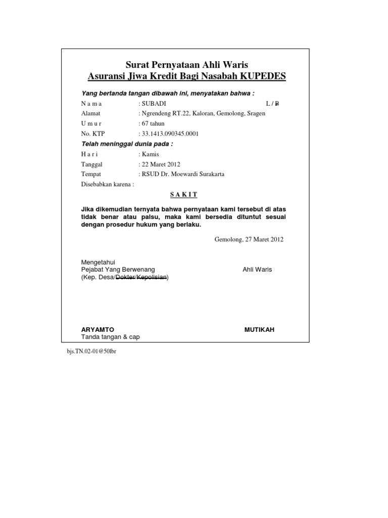 Pasalnya, kamu sudah memiliki kekuatan hukum yang sah, sahabat 99. Contoh surat waris dengan berbagai kasus. Untuk itu pada kesempatan kali ini saya akan bagikan informasi tentang contoh format surat keterangan ahli waris, semoga bermanfaat. Contoh surat pernyataan ahli waris tanah gawe cv. Yang bertanda tangan dibawah ini : 0 ratings0% found this document useful (0 votes). Surat pernyataan sebagai ahli waris. Namun untuk urusan komunikasi perusahaan maupun berbagai lembaga maupun instansi pemerintah, penggunaan surat masih merupakan sesuatu hal yang wajib. Semoga dapat memberikan manfaat yang berharga bagi anda dan jangan lupa untuk share postingan contoh surat. Contoh surat pernyataan pembagian warisan. Surat keterangan pernyataan ahli waris diatas dapat diketik maupun ditulis tangan, namun surat hasil ketikan tentu akan lebih baik lagi apalagi jika dicetak dengan printer laser agar hasil ketikan bagus dan tidak mudah luntur. Contoh surat perjanjian jual beli tanah pdf doc lamudi. Tenang, rumah123.com akan memberikan contohnya di akhir artikel supaya kamu makin.